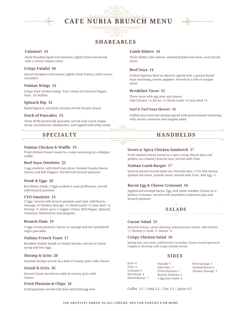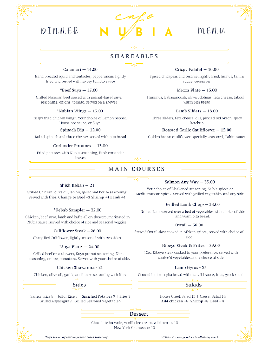 Looking for a cozy spot to relax and indulge in delicious food? The Cafe Nubia Menu offers a wide range of mouth-watering dishes that will make you feel right at home. Located at 3920 Rosemeade Pkwy #100 in Dallas, TX, it’s the perfect place to gather with friends or enjoy a quiet meal by yourself. Whether you're in the mood for a hearty breakfast, a light lunch, or a sweet treat to finish off your day, there’s something for everyone. From freshly brewed coffee to flavorful sandwiches, every item on the menu is crafted with care and made from high-quality ingredients. Don’t forget to check out their specialty drinks and desserts - they’re perfect for a mid-day pick-me-up or a sweet ending to your meal.
